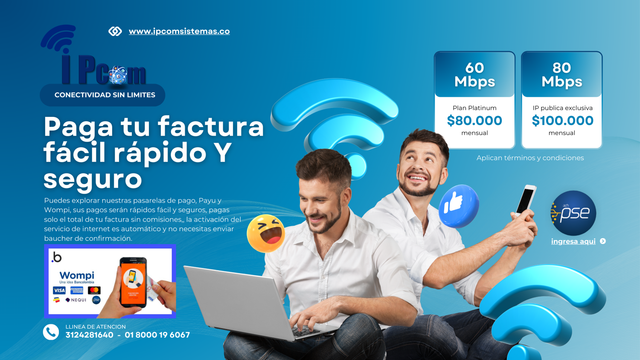 En IPcom Sistemas facilitamos el pago de tu factura de internet y telecomunicaciones de manera 100% digital a través de nuestras pasarelas seguras: