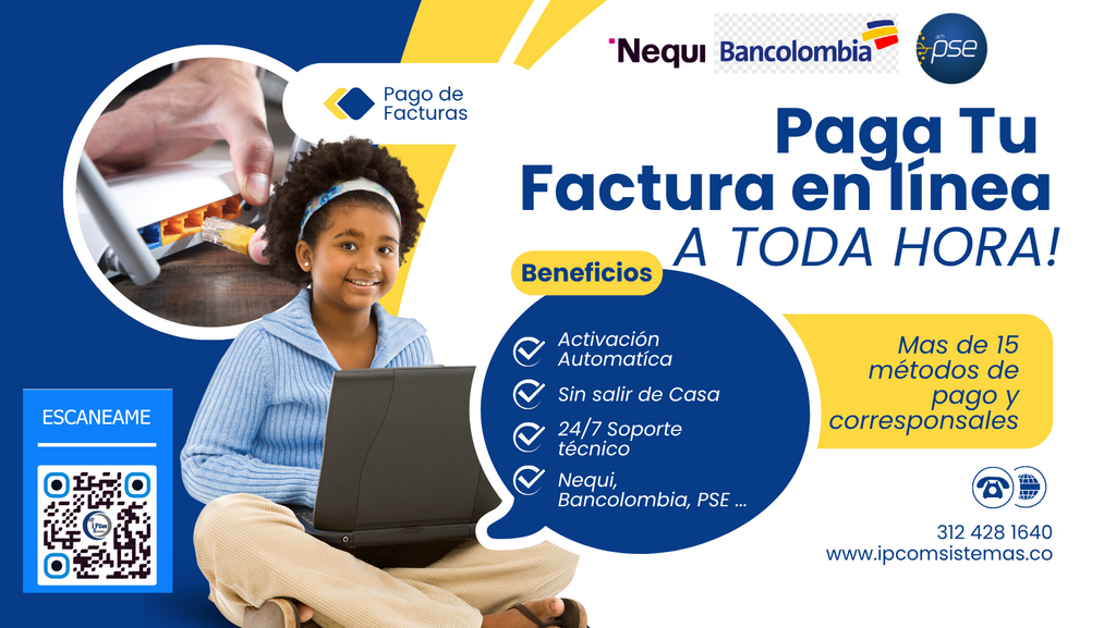 Evita desplazamientos y paga desde casa u oficina. ¿Necesitas ayuda? Contáctanos al 3124281640 o a facturacion@ipcomsistemas.co.